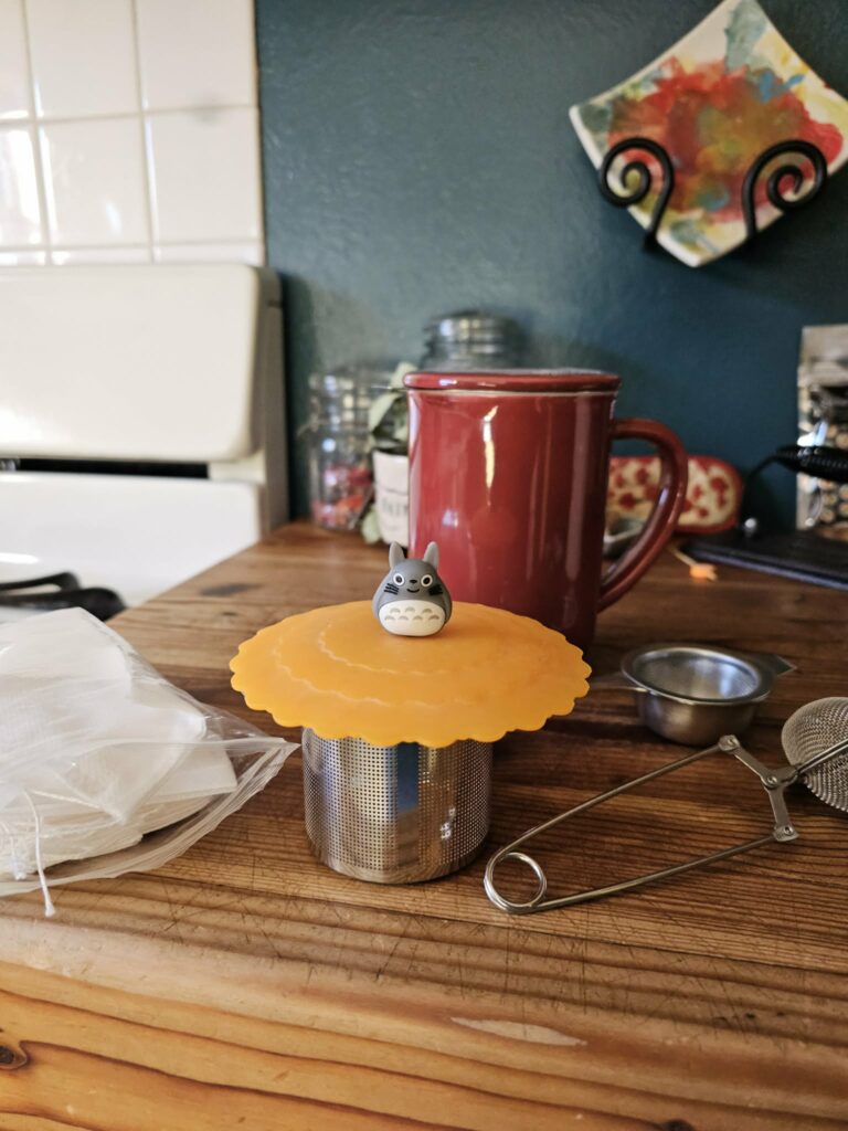 - Tea Cup Lid – Totoro Style – There are so many options for lids, but again, you can just use a plate or leave your cup open. Steeping with a lid keeps all of the good stuff in your mug, so you can get it in your body when your tea is ready.