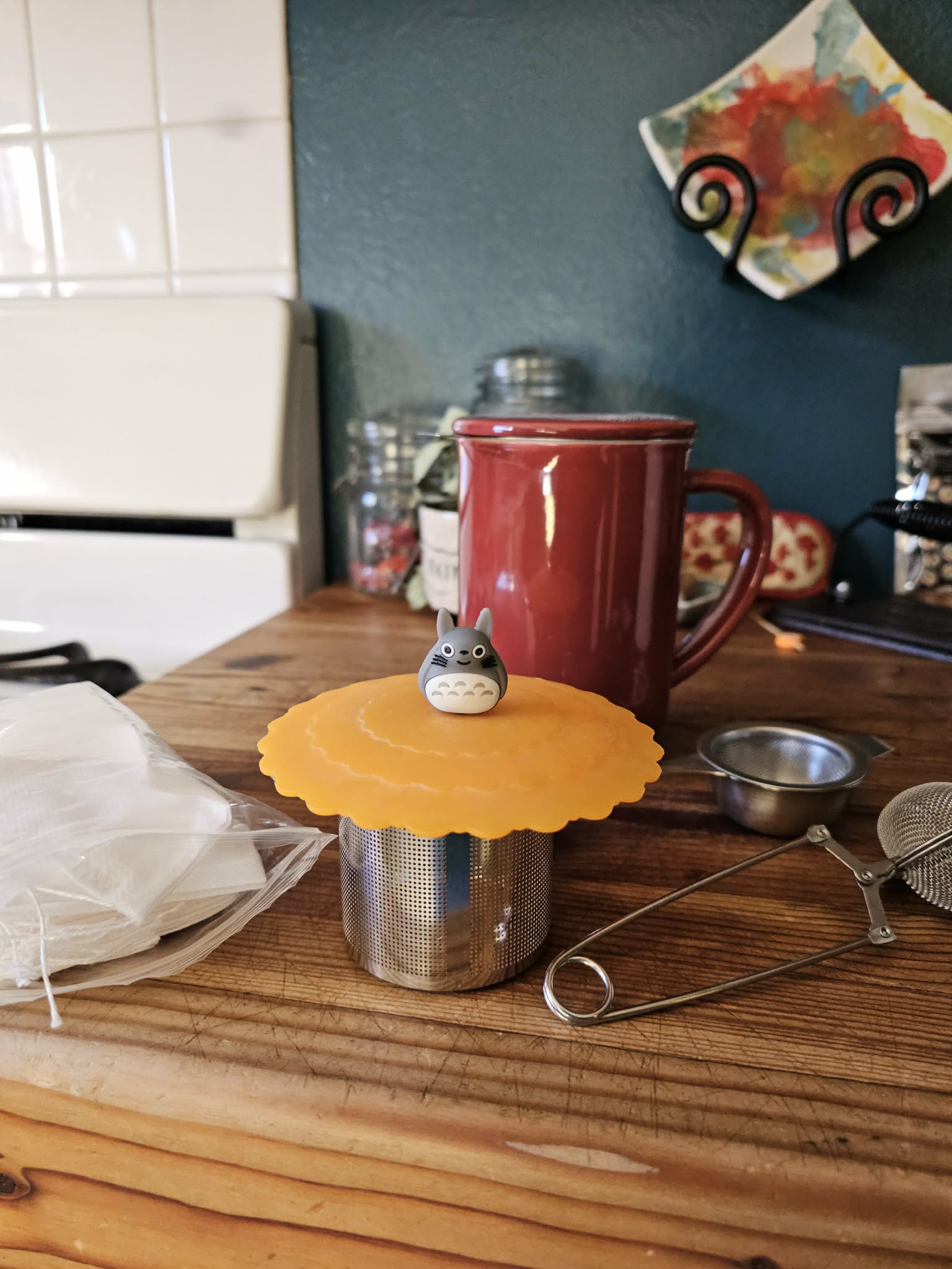 - Tea Cup Lid – Totoro Style – There are so many options for lids, but again, you can just use a plate or leave your cup open. Steeping with a lid keeps all of the good stuff in your mug, so you can get it in your body when your tea is ready.